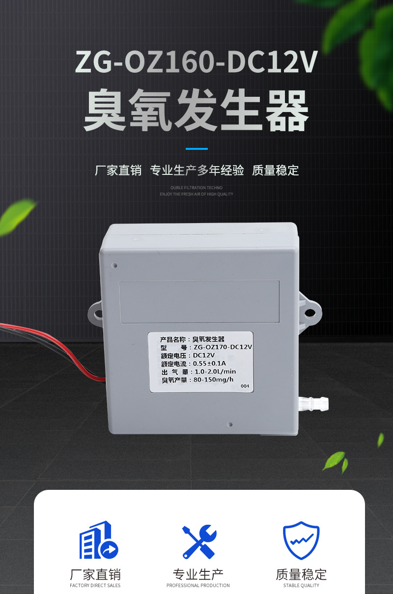ZG-OZ160-DC12V小型臭氧發生器采用最新的臭氧核心放電體,包括臭氧發生管、臭氧驅動電路和氣泵的一體化設計,只要接上電源即可提供高效穩定的臭氧輸出,安裝使用維護方便。
